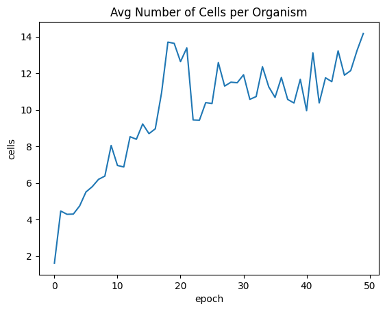 sns.lineplot(x="epoch", y="cells", data=avgSizeByEpoch ).set_title("Avg Number of Cells per Organism")