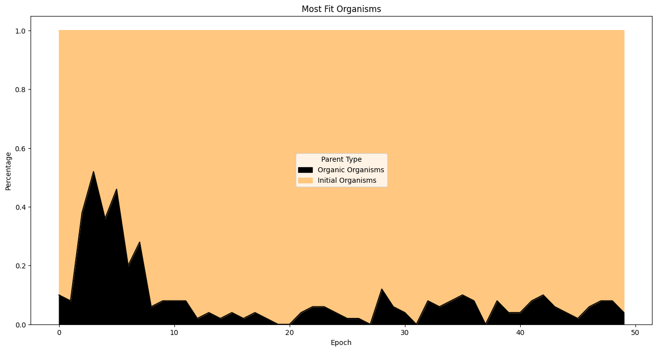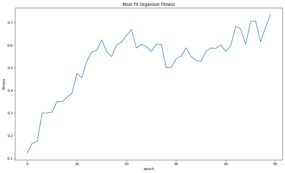 We finally got trees!! This was the main goal for Project Genesis. The average fitness was still trending upwards by the 50th epoch.