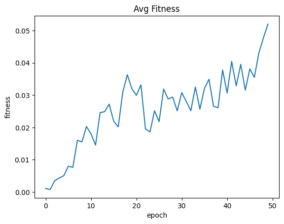 sns.lineplot(x="epoch", y="fitness", data=avgFitnessByEpoch ).set_title("Avg Fitness")