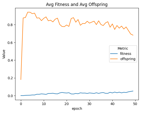 | linePlt = compareAvgMetricsByEpoch(fullSimulationDataDf, 'fitness', 'offspring')