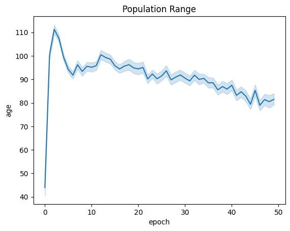 | linePlt = sns.lineplot(x="epoch", y="age", data=fullSimulationDataDf ).set_title("Population Range")
