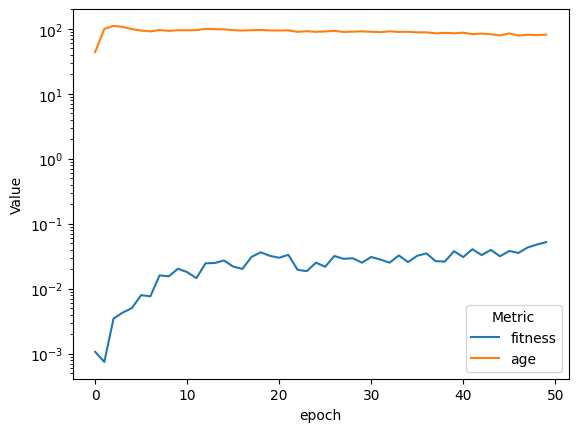 | compareAvgMetricsByEpoch(fullSimulationDataDf, 'fitness', 'age').set_yscale('log')