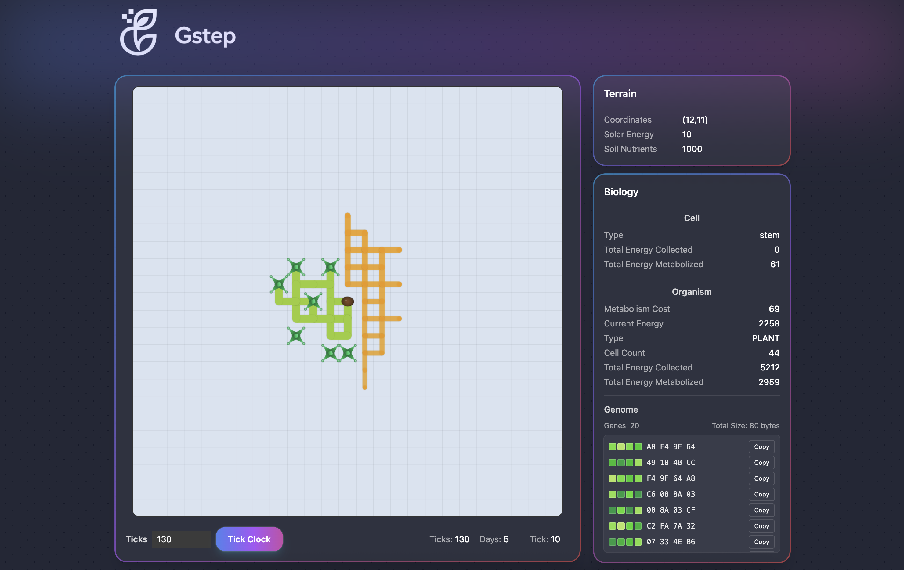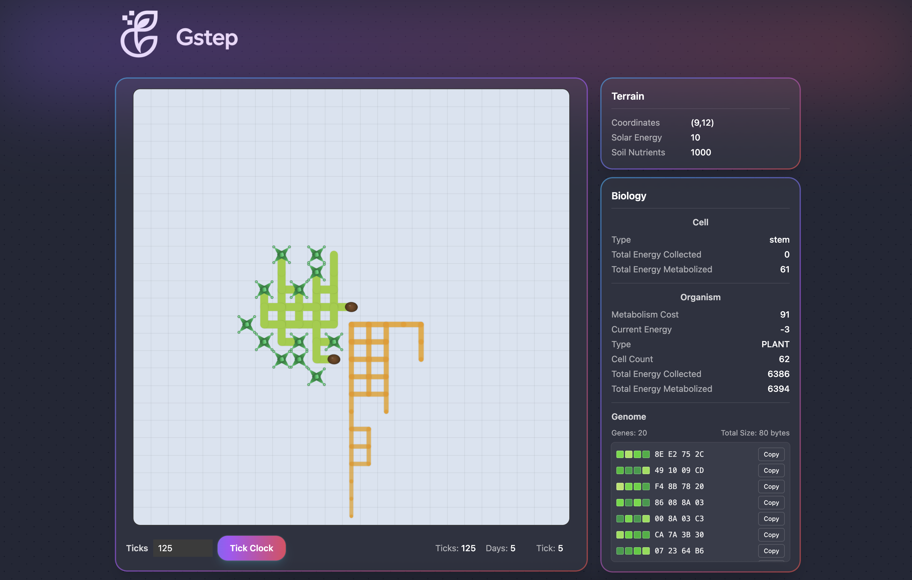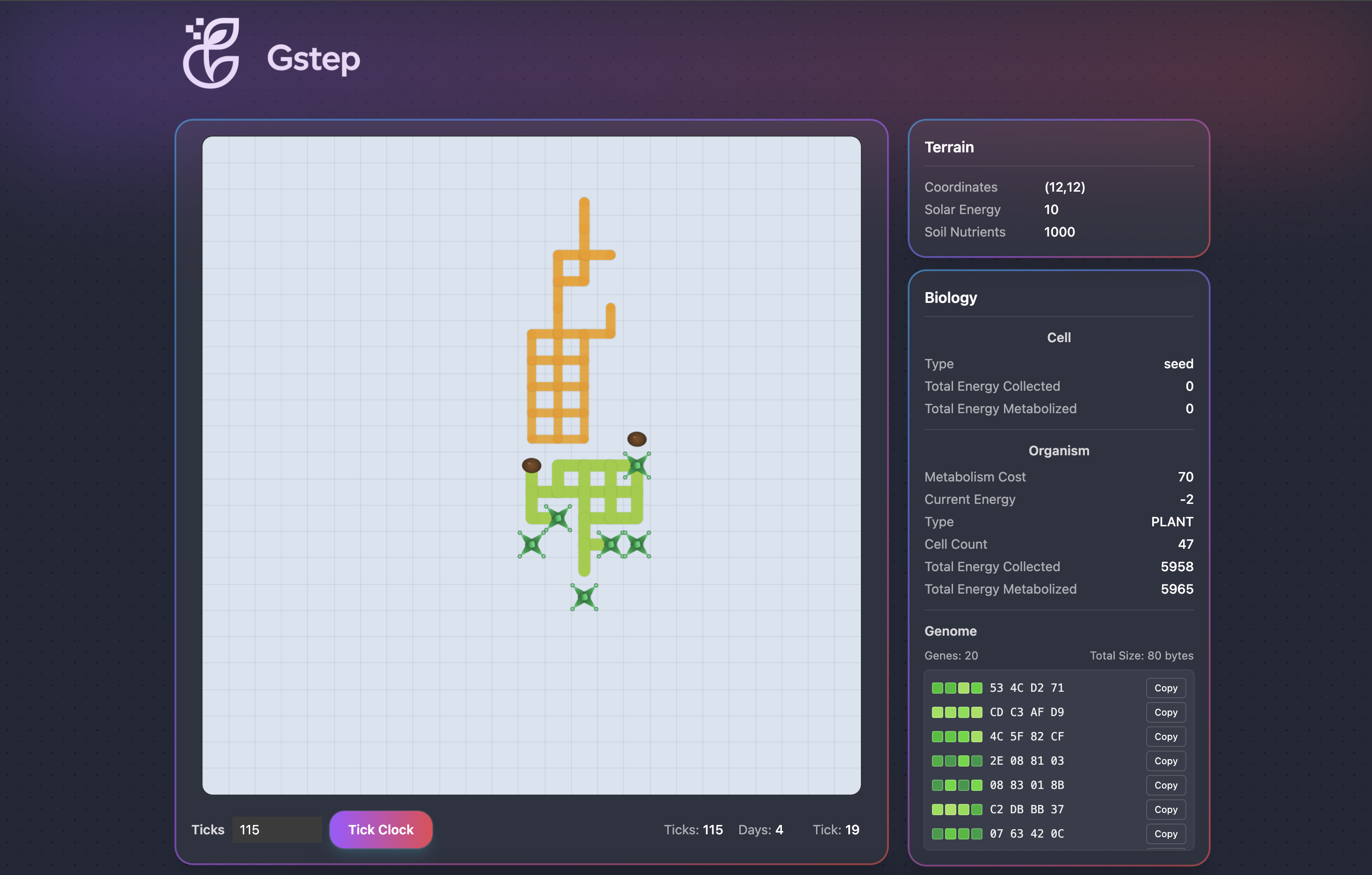 - Right/Bottom: Gstep snapshot of the most fit organism at that same epoch (micro phenotype).