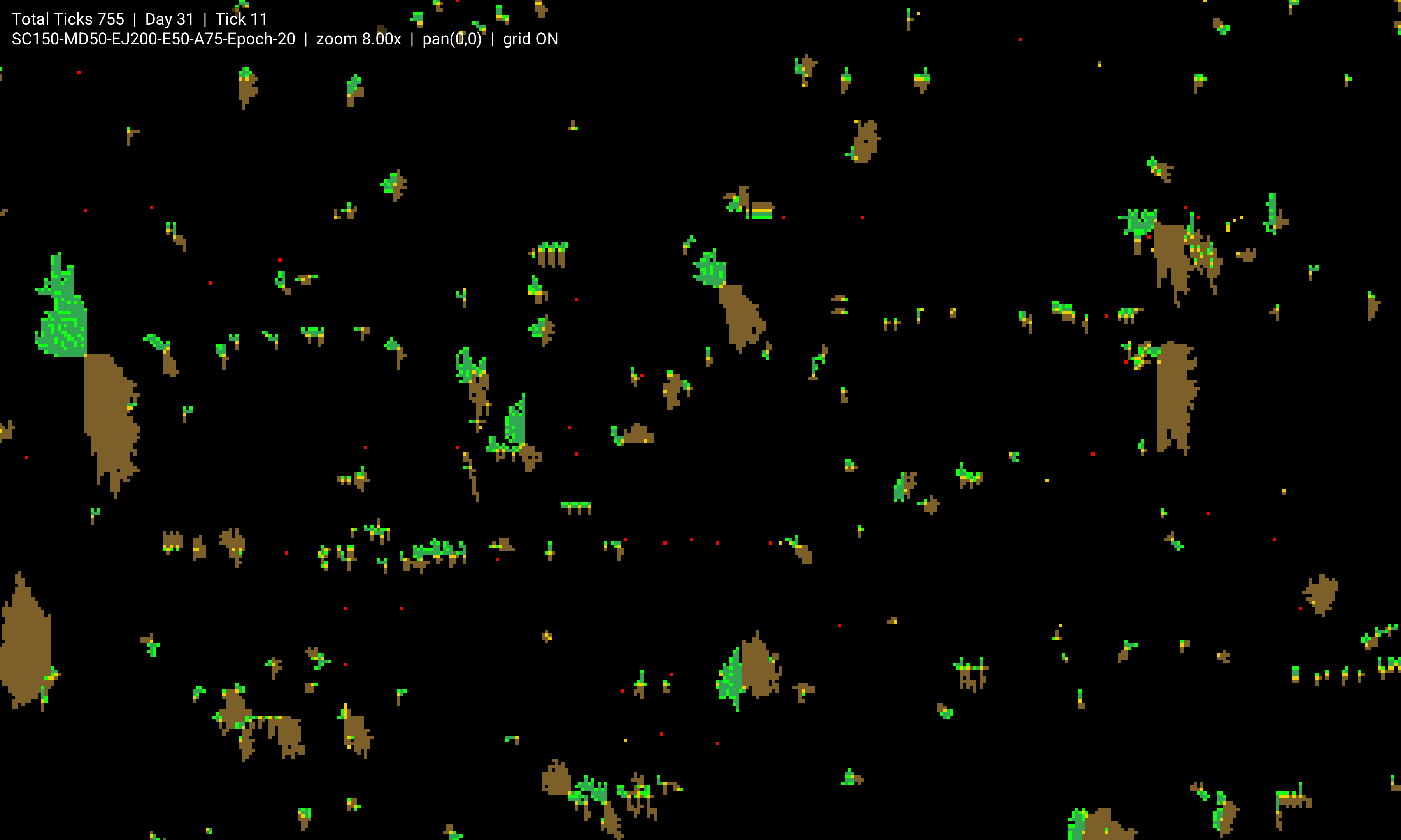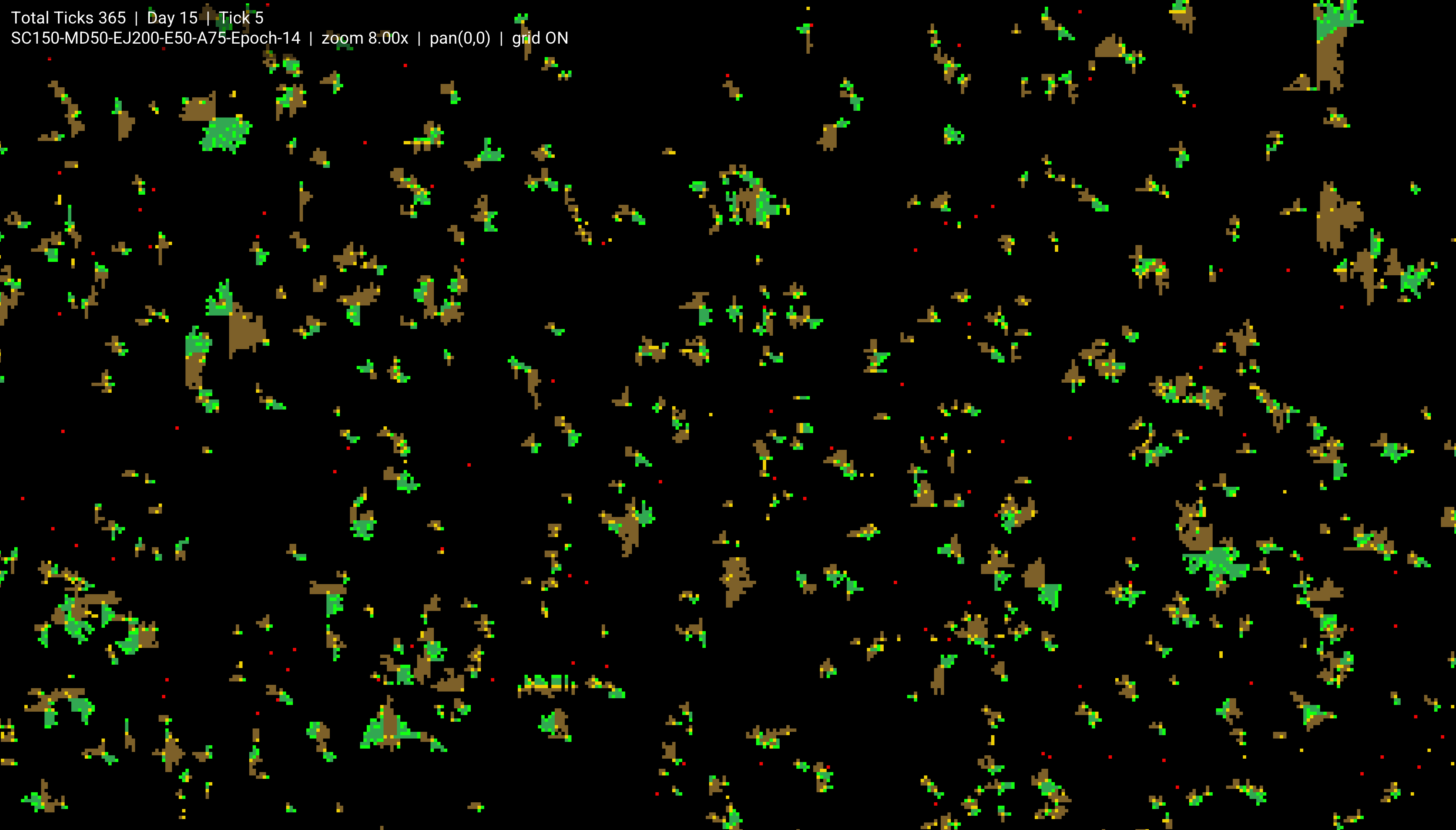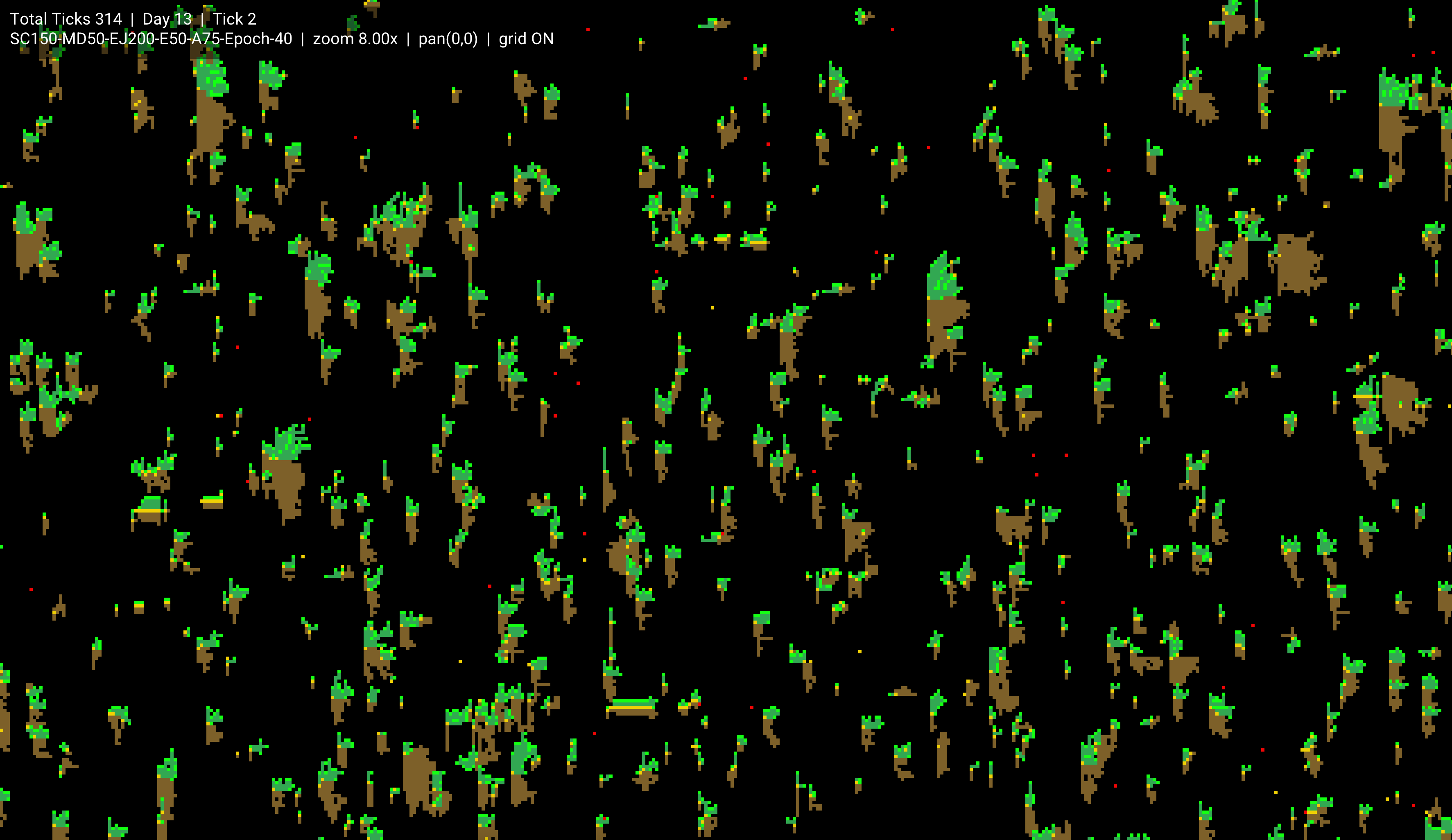 This walkthrough pairs world snapshots from GeneGL with most-fit organism views from Gstep at the same epochs. The goal of this simulation was to evolve a tree-like organism within a 2D world. The final organism fits this description beautifully.